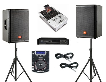 * A 2 channel DJ mixer with integrated iPod dock * Two 12" or 15" cabinets with stands * CD Player * Power amp * All cables